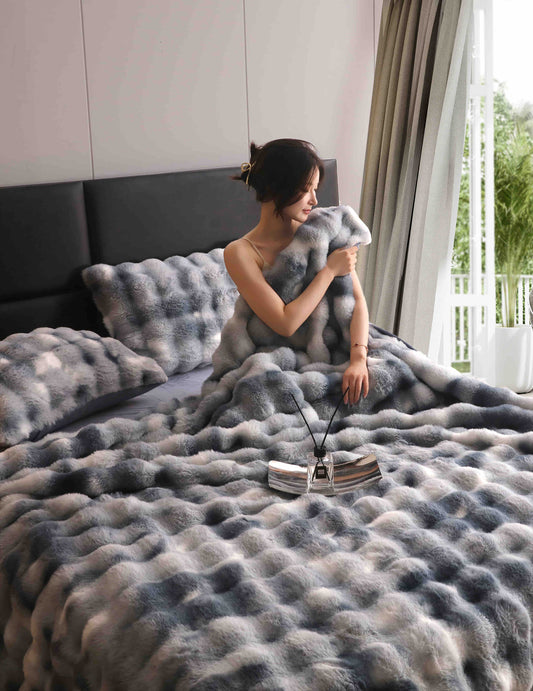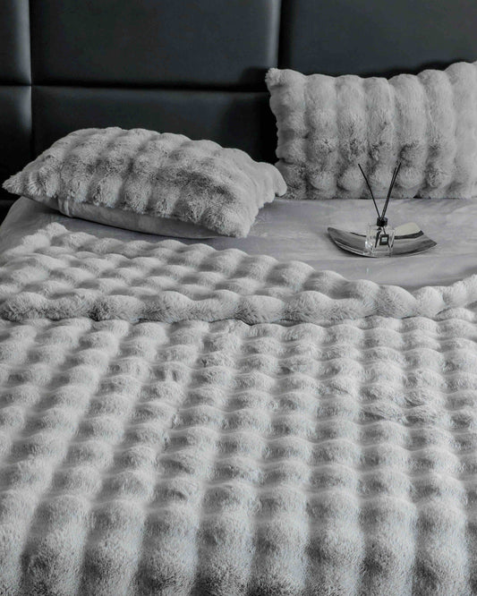 Lenjerie pat dublu, din Blanita artificiala de Iepure,Extra Pufoasa, 6 piese, Gri-Alb , LJB004