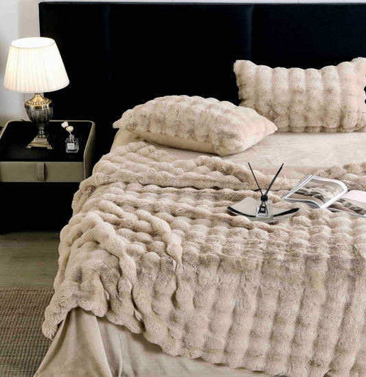 Lenjerie pat dublu, din Blanita artificiala de Iepure,Extra Pufoasa, 6 piese, Bej-Pudră , LJB006