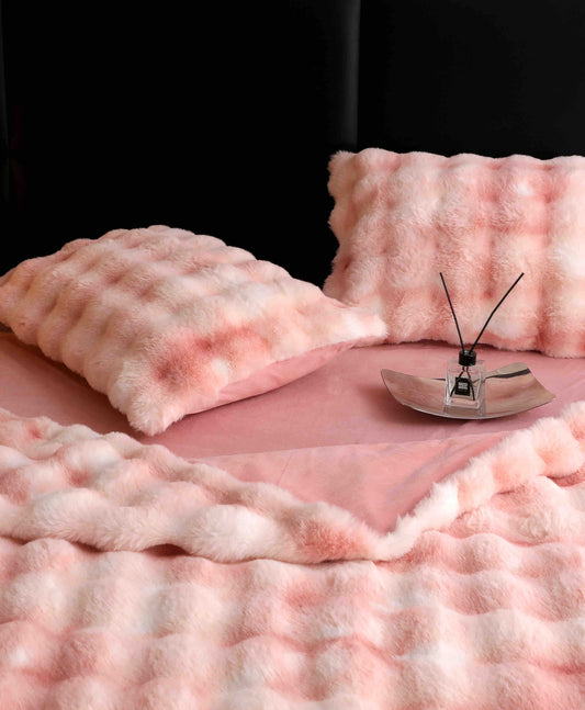 Lenjerie pat dublu, din Blanita artificiala de Iepure, Pufoasa, 6 piese, Alb-Roz, LJB42