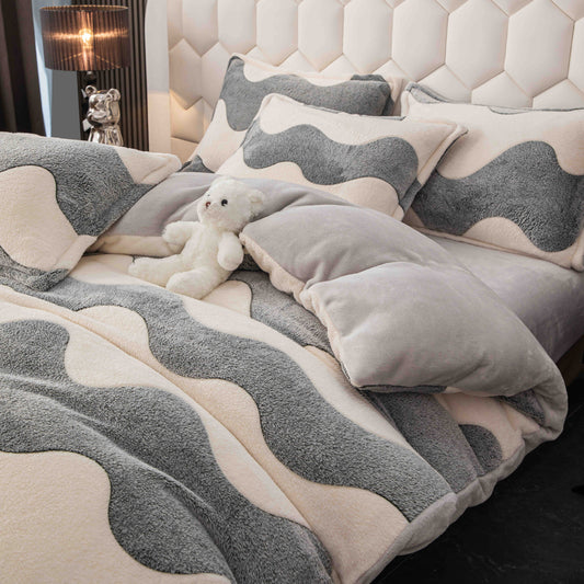 Lenjerie pat dublu Cocolino, blană de iepure artificială, Model Dungi, Cearsaf cu Elastic, Gri inchis, C-127
