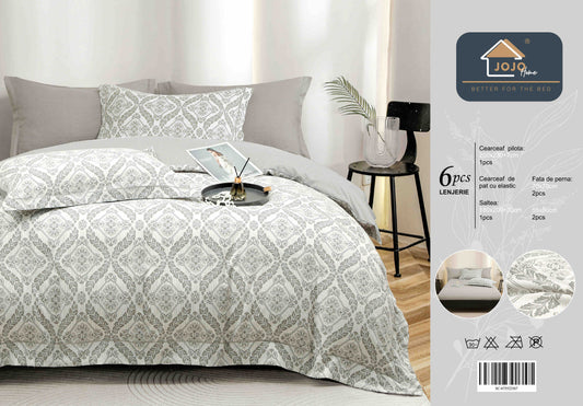 Lenjerie de Pat Dublu, Model Lux, Cutie Cadou, 6 Piese, Cearceaf cu Elastic, Bumbac, LJH-010
