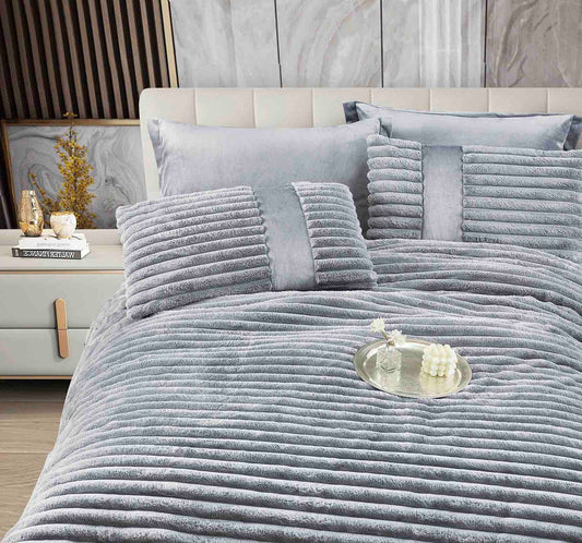 NOU ! Lenjerie de pat dublu cu PILOTĂ inclusă ,blană de iepure, 6 piese, Gri