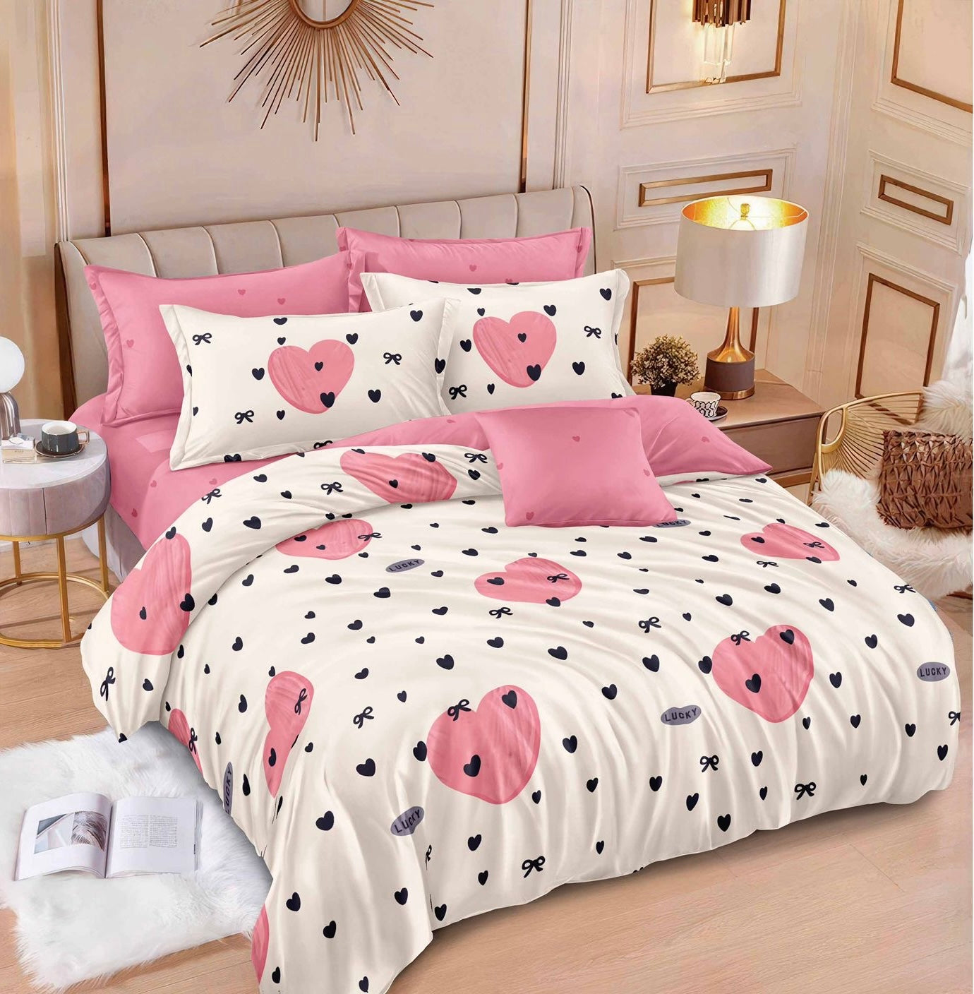 Lenjerie de pat dublu, Bumbac finet, Cearceaf cu elastic sau normal, 6 piese, Alb-Roz, LBF47