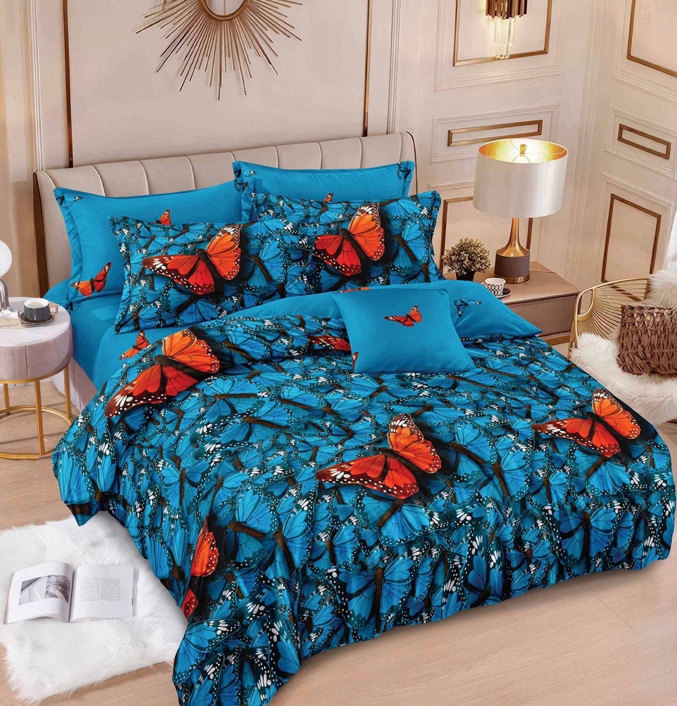 Lenjerie de pat dublu, Bumbac finet, Cearceaf cu elastic sau normal, 6 piese, Albastru fluturi, LBF81