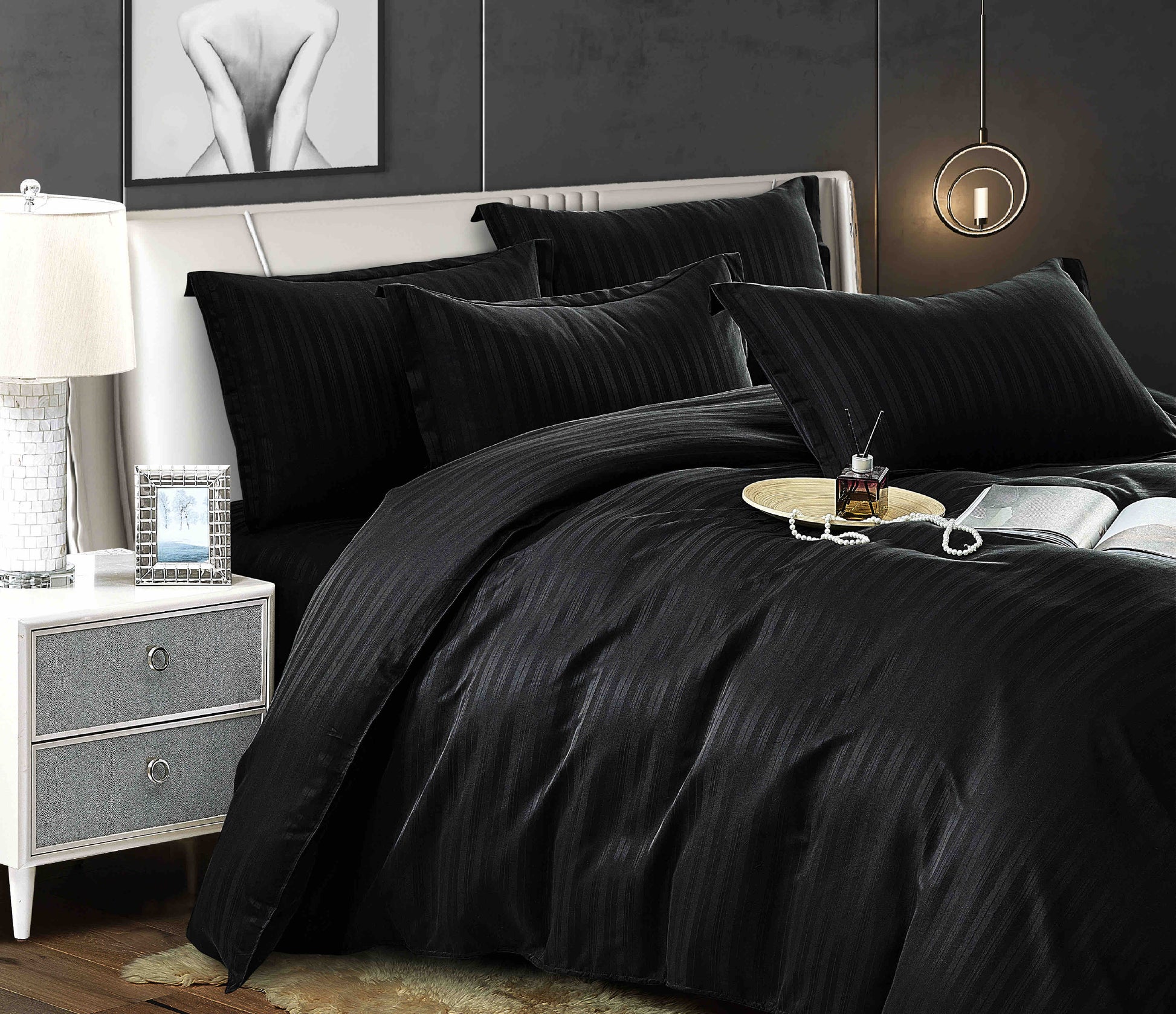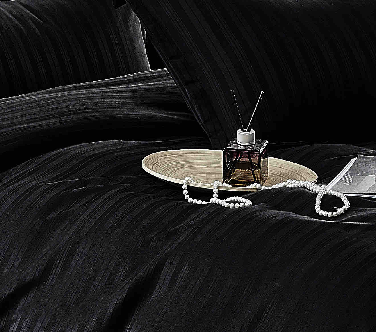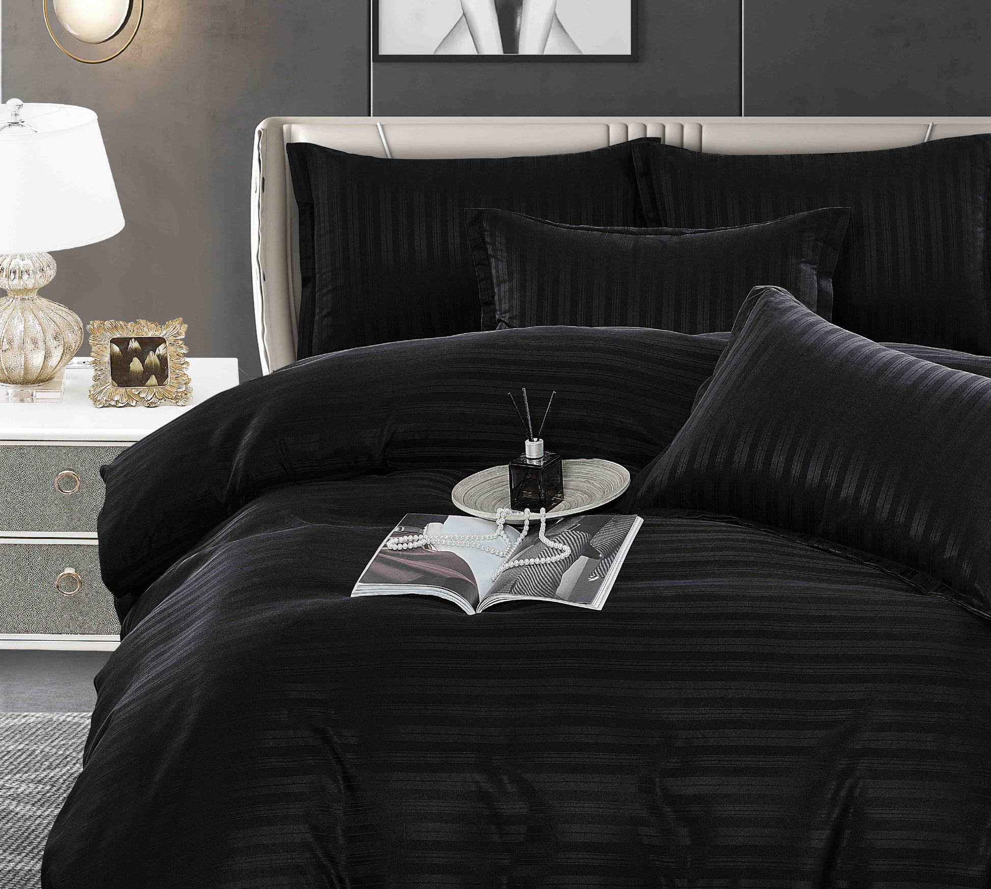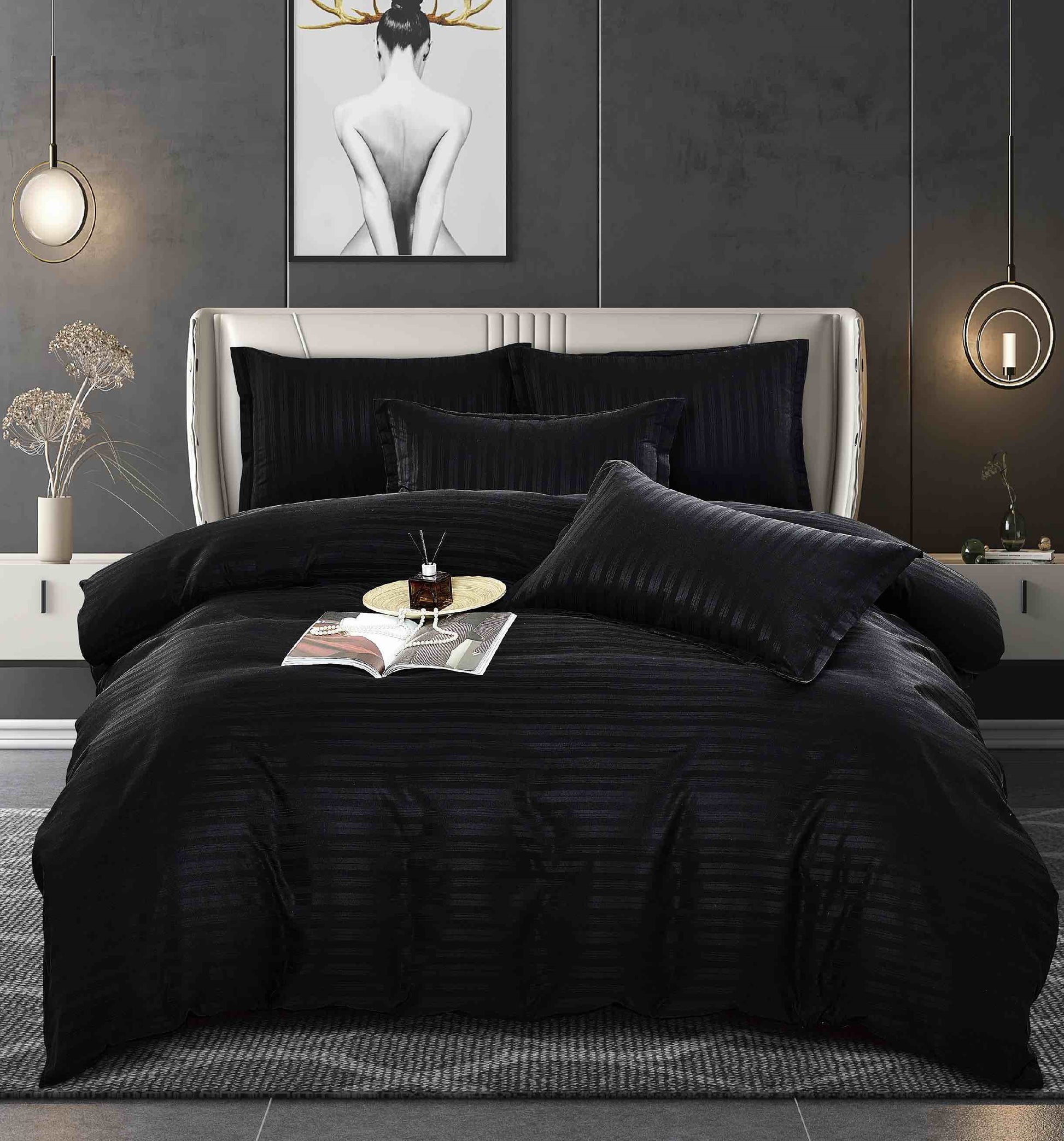 Lenjerie Horeca Deluxe, pat dublu, Damasc finetat , cearsaf normal, 6 piese , Negru, DAM002