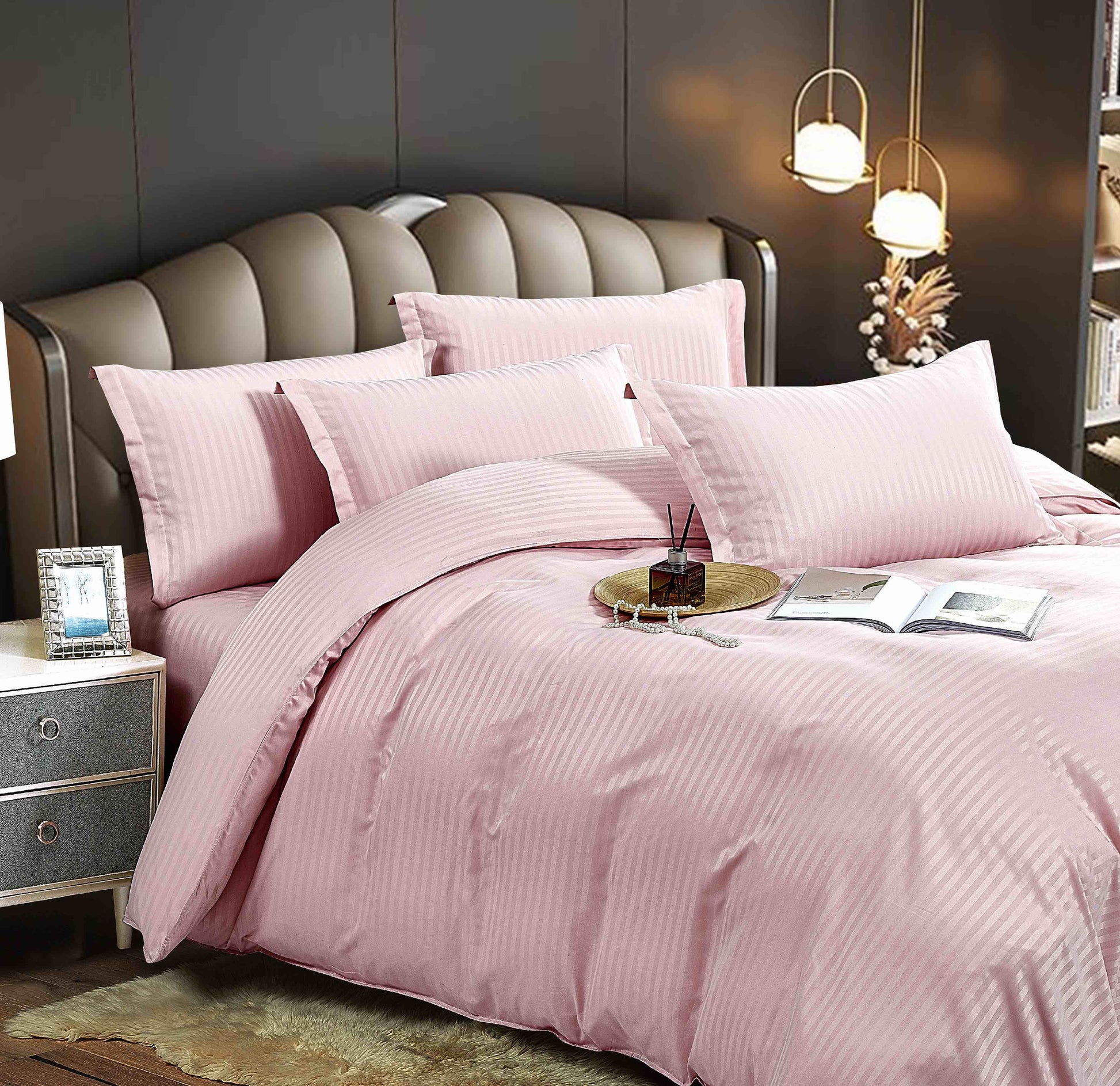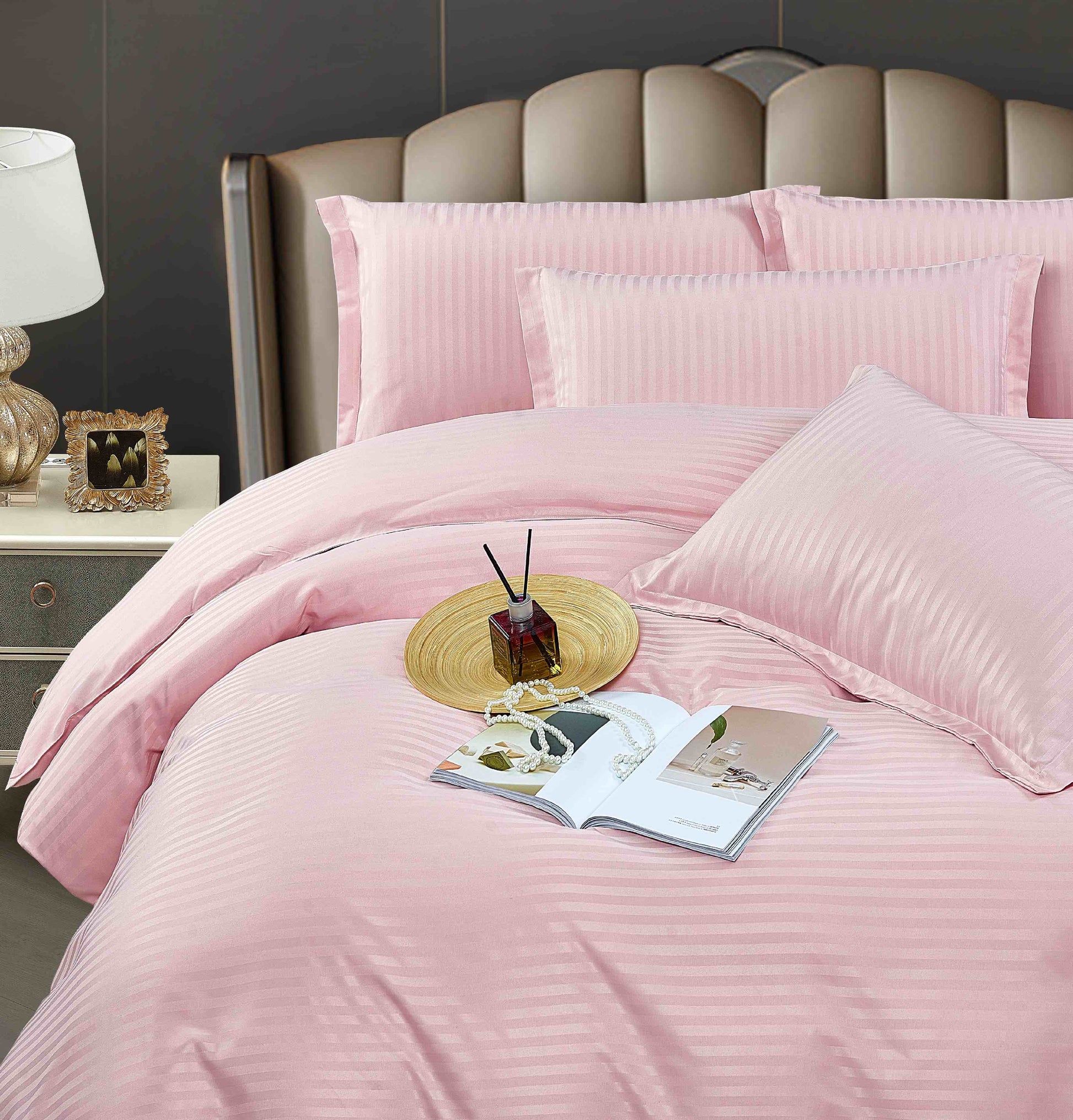 Lenjerie Horeca Deluxe, pat dublu, Damasc finetat , cu elastic , 6 piese , Roz-deschis, DAM025
