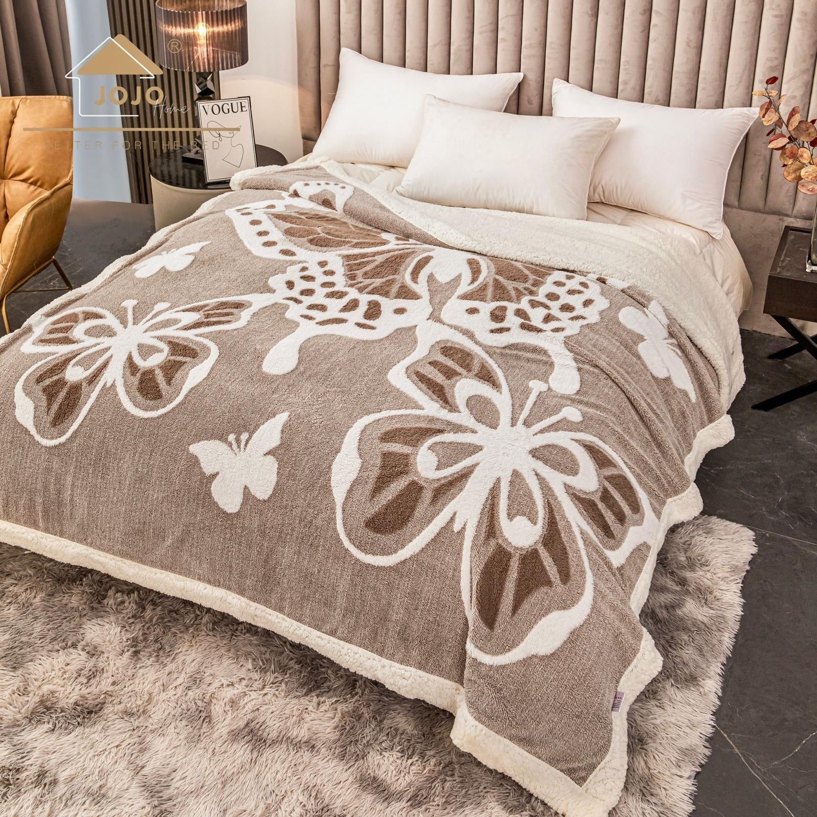 Răsfață-te cu confortul suprem al acestei pături groase Cocolino cu blăniță, marca Jojo Home, perfectă pentru serile reci și momentele de relaxare. Realizată dintr-un material Cocolino fin și pufos, cu un model elegant de fluturi 3D pe o parte și blăniță albă artificială pe cealaltă, această pătură combină luxul cu funcționalitatea.