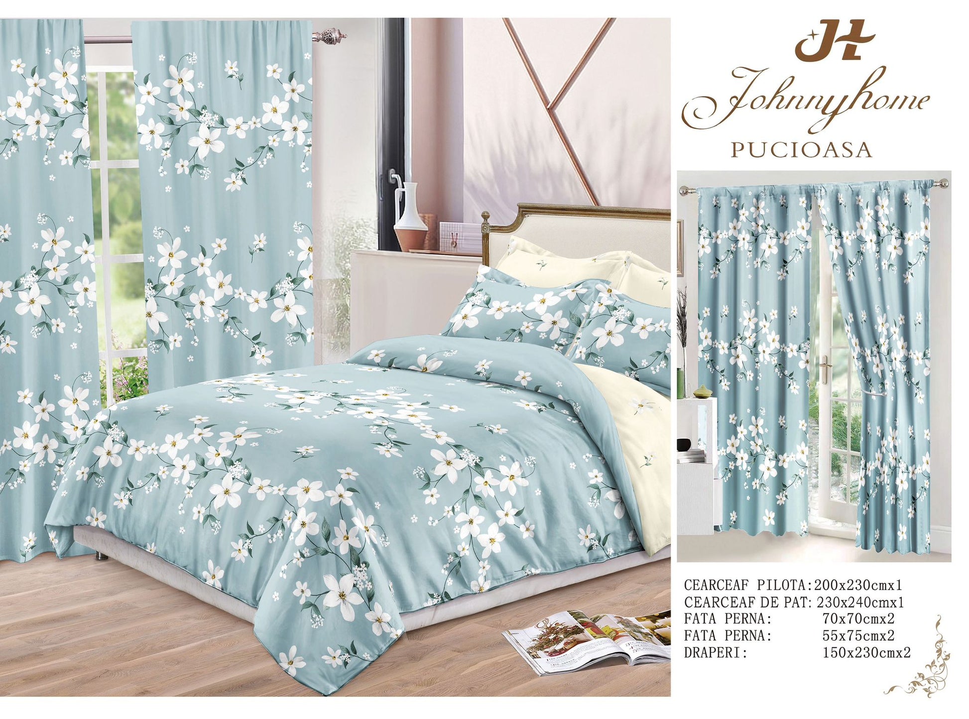 Set Lenjerie de pat Dublu Pucioasa + Draperii , set 8 piese, Flori, LDP010